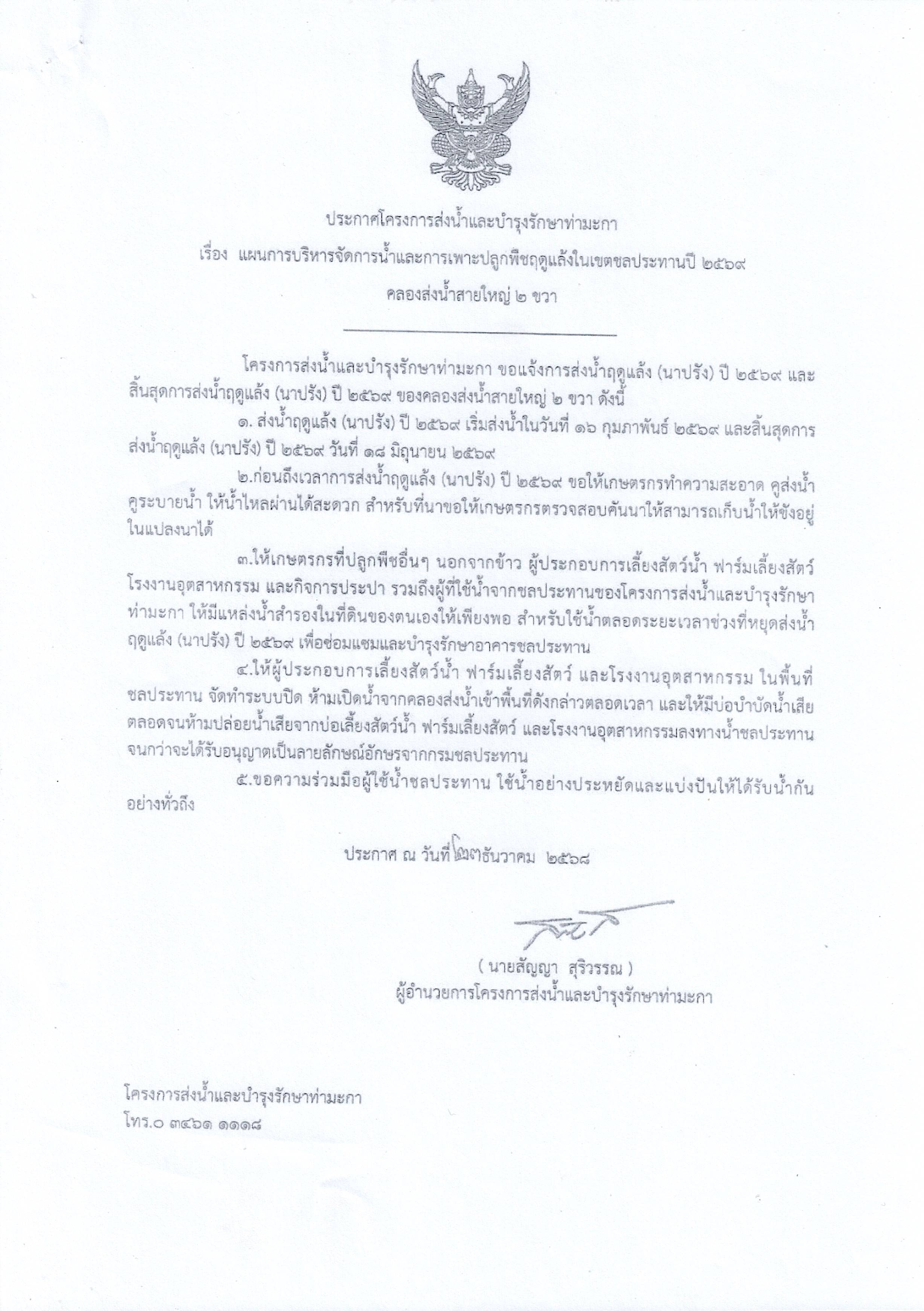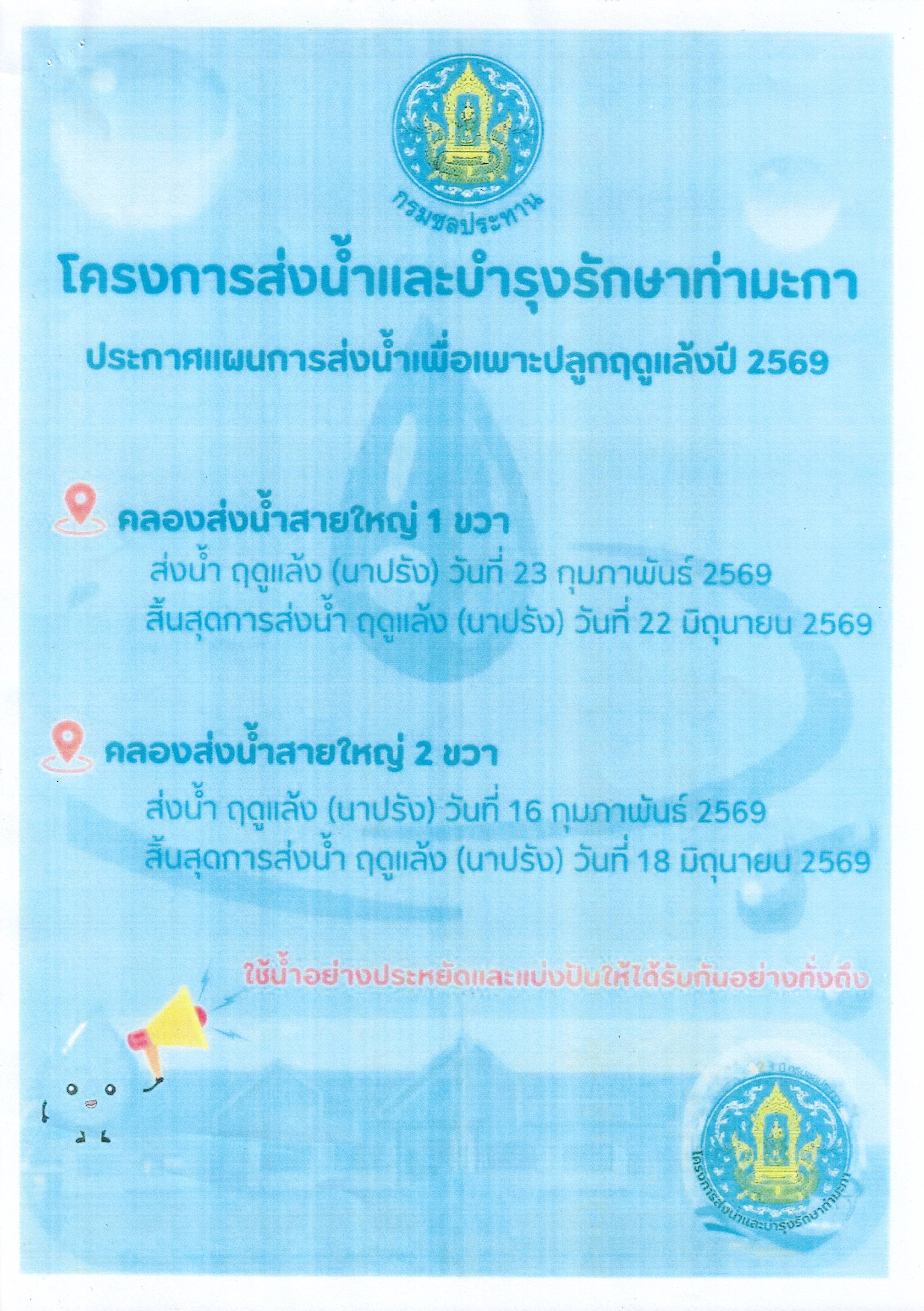 องค์การบริหารส่วนตำบลหนองกลางนา ขอประชาสัมพันธ์ ประกาศโครงการส่งน้ำและบำรุงรักษาท่ามะกา เรื่อง แผนการบริหารจัดการน้ำและการเพาะปลูกพืชฤดูแล้งในเขตชลประทาน ปี 2569 คลองส่งน้ำสายใหญ่ 2 ขวา
